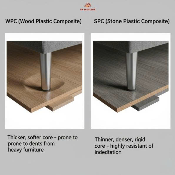 - WPC (Wood Plastic Composite): A thicker and softer core, which is quiet and comfortable but a little bit prone to deep dents.