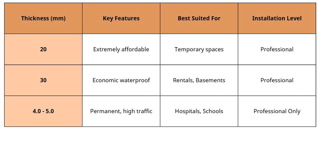 • Key Notes: This thickness is commonly categorized as dry-back LVT or SPC-based vinyl rather than rigid-core SPC. Best suited for low-load environments where ease of replacement and short lifecycle use are expected.